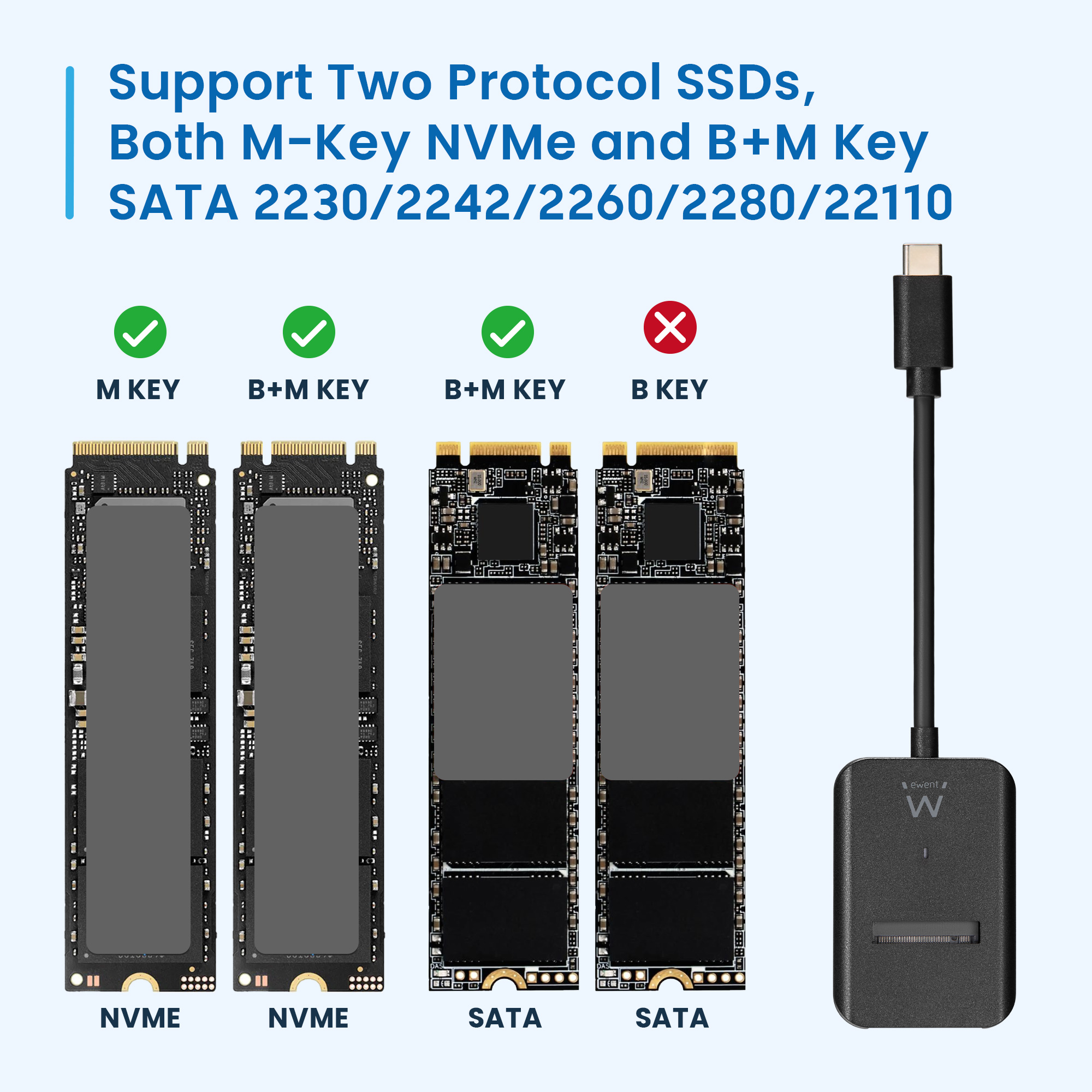 - Suppor two protocol SSDs,both M-key NVMe and B+M key SATA 2230,2242,2260,2280,22110 - Easily backup your data to and from a M.2 NVMe/SATA SSD - USB 3.2 Gen2 10Gbps data transfer - Support UASP and TRIM