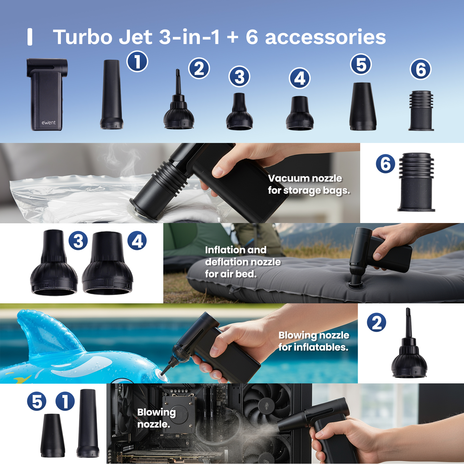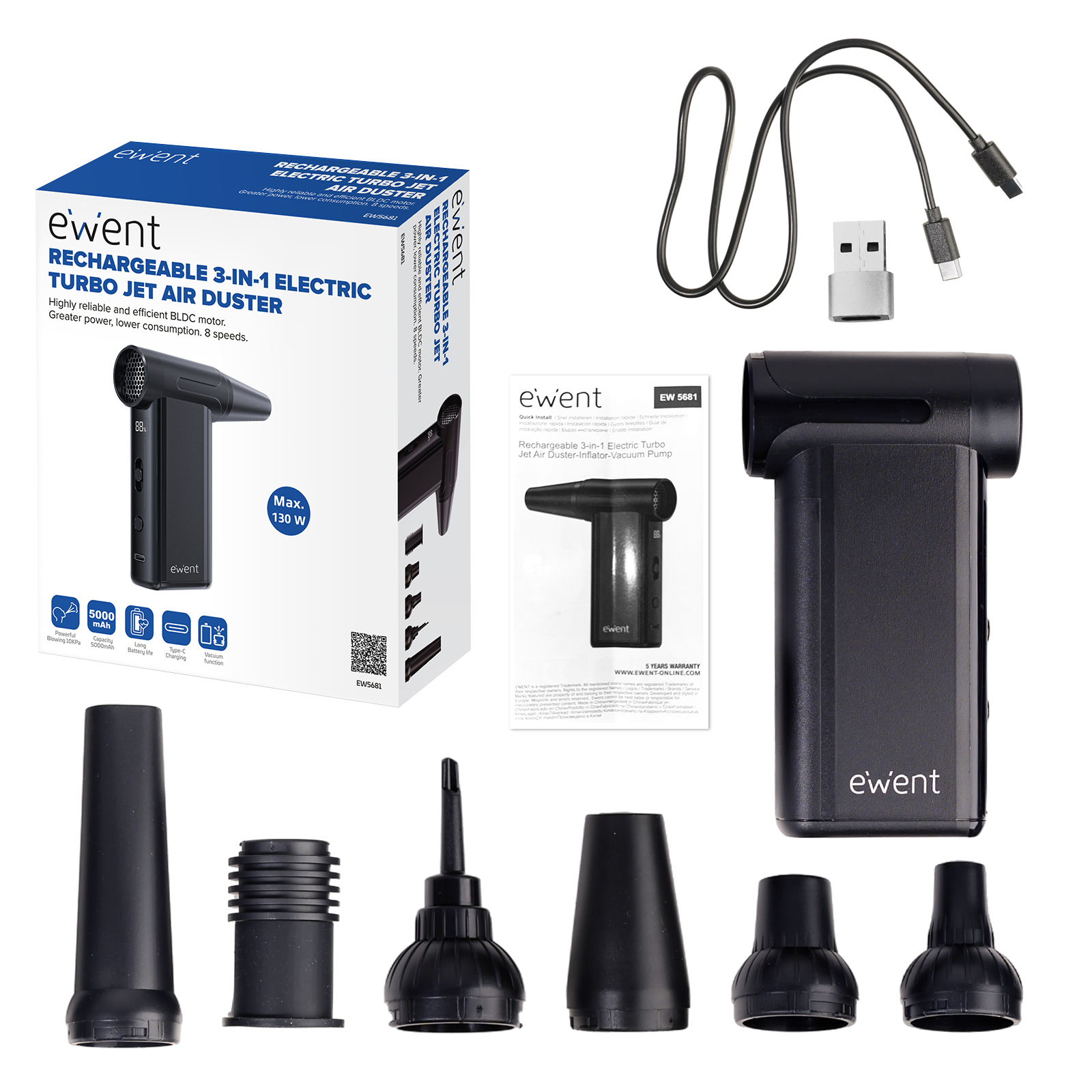 Motor BLDC de gran fiabilidad y alta eficiencia. Mayor potencia, menor consumo. 8 velocidades. - Turbo Jet 3 en 1. En tu mano 3 dispositivos concentrados en uno solo. Plumero de aire, Inflador y Vaciador de aire. Incorpora 6 accesorios y cable de carga USB-C - Baterias de alta capacidad y durabilidad. Incorpora dos baterías de Litio 18650 de 2500mAh de alta capacidad y larga duración - Dispone de una gran potencia de 130W/130000rpm y 10KPa. Discreto tamaño que permite llevarlo en tu maletín o maleta si viajas. Guárdalo en su bolsa de viaje incluida. - Ideal para inflar colchones, flotadores. Discreto pero con una gran potencia de vacio. Imprescindible para usarlo en casa, el trabajo o en el coche.