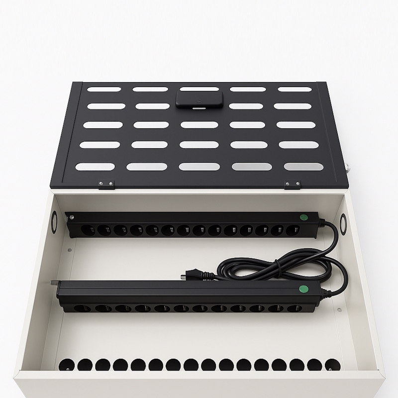 - Configurazione semplice con gestione sicura dell'alimentazione - Area di archiviazione sicura dell'adattatore di alimentazione con chiave - Scomparto superiore per adattatori di alimentazione AC - Scompartimenti designati per una configurazione pulita dei cavi - Ricarica istantanea senza problemi - Collegalo a qualsiasi presa per una ricarica immediata - Design efficiente e affidabile per una ricarica senza interruzioni