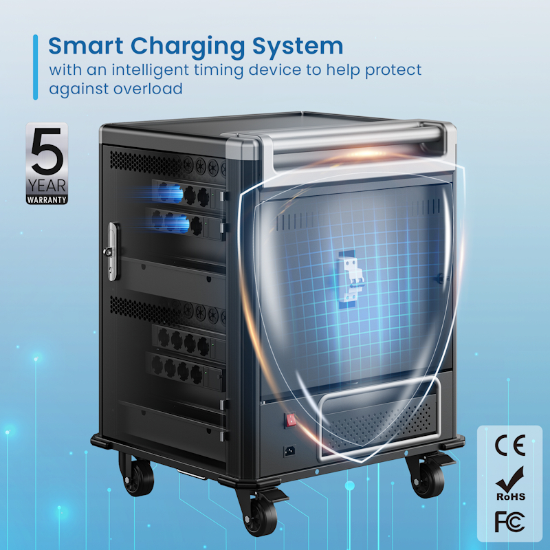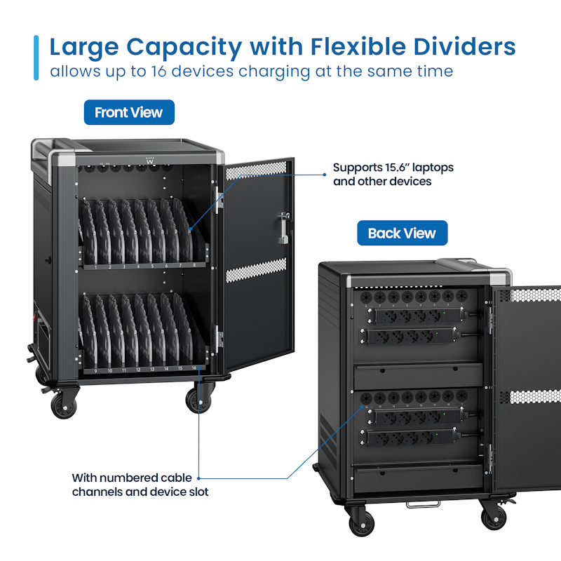 - I ripiani con divisori flessibili e durevoli consentono di riporre e rimuovere facilmente quasi tutti i Chromebook, laptop o tablet - Efficiente sistema di ricarica intelligente per tutti i tuoi dispositivi da un'unica presa, proteggendo i circuiti dal sovraccarico. Il sistema di ricarica smart fornirà corrente alla prima metà di prese per 15 minuti. Allo scadere fornirà la carica alla seconda metà. E continuerà ad alternarsi finche l’assorbimento non sarà inferiore a 14 Ampere che permetterà la carica in contemporanea di tutte le prese. L’indicatore LED all’esterno del carrello mostrerà quale set di prese è in carica. - La gestione dei cavi nella sezione anteriore del dispositivo e la sezione di alimentazione posteriore separata organizzano facilmente gli alimentatori e indirizzano i cavi a ciascun dispositivo - Sia la sezione del dispositivo che la sezione di alimentazione posteriore separata sono dotate di porte in acciaio con meccanismo di chiusura a chiave a 3 punti e la possibilità di aggiungere il proprio lucchetto per una maggiore sicurezza - Ruote di alta qualità da 5" con freni e blocco direzionale e maniglia di spinta incassata per la massima mobilità e contenimento dell’ingombro